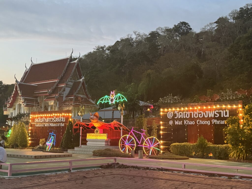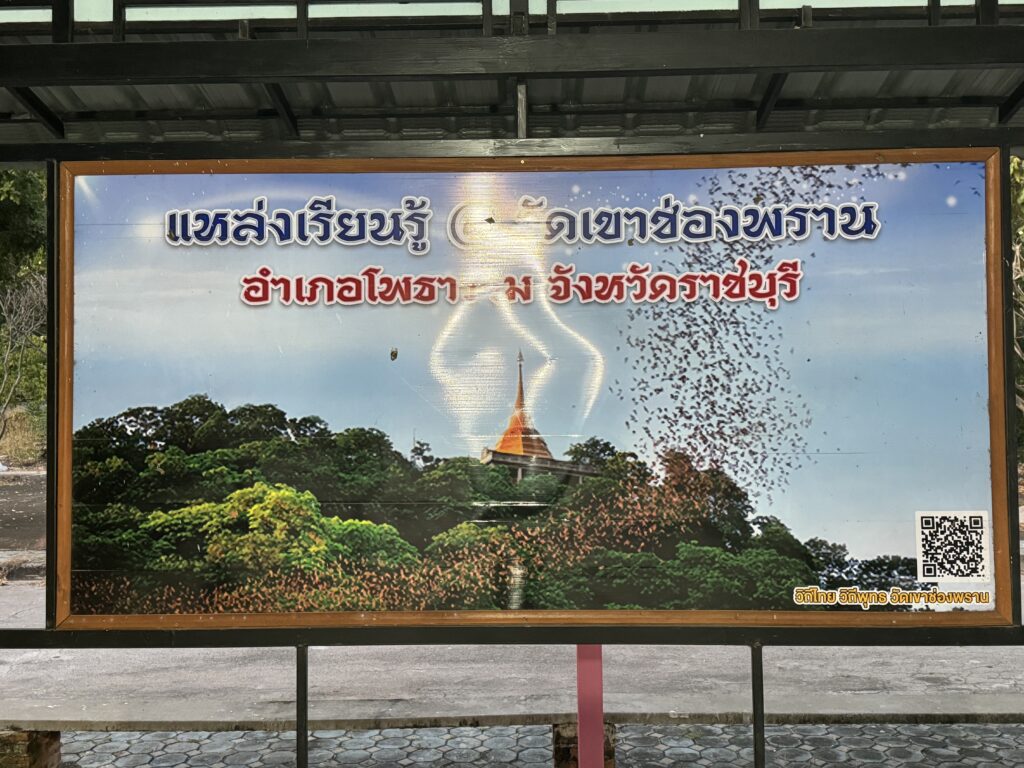 ・この寺院は1914年に建立され、ラーマ6世時代には、ボーイスカウト達がキャンプ場として利用しました。後ろの山に洞窟がありコウモリたちはそこに住んでおりキーキーと鳴き餌探しに出るまで休んでおるのです。