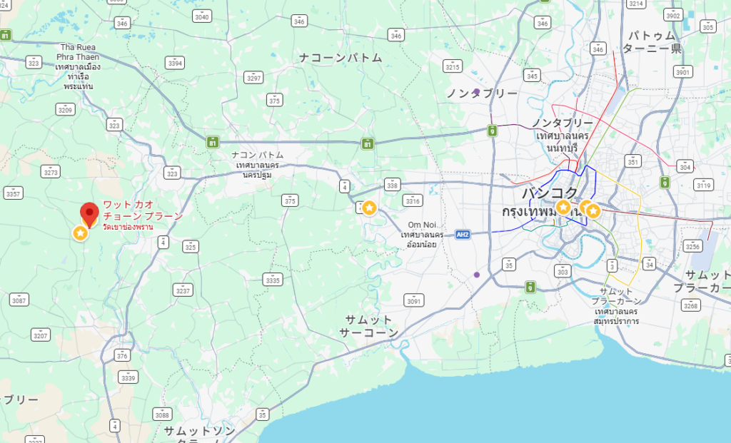 ・ワット・カオチョンプランはラチャブリー郡にあり、バンコクからは西に約100km離れてます。バンコクから訪れる場合はタクシーかバスになります。
