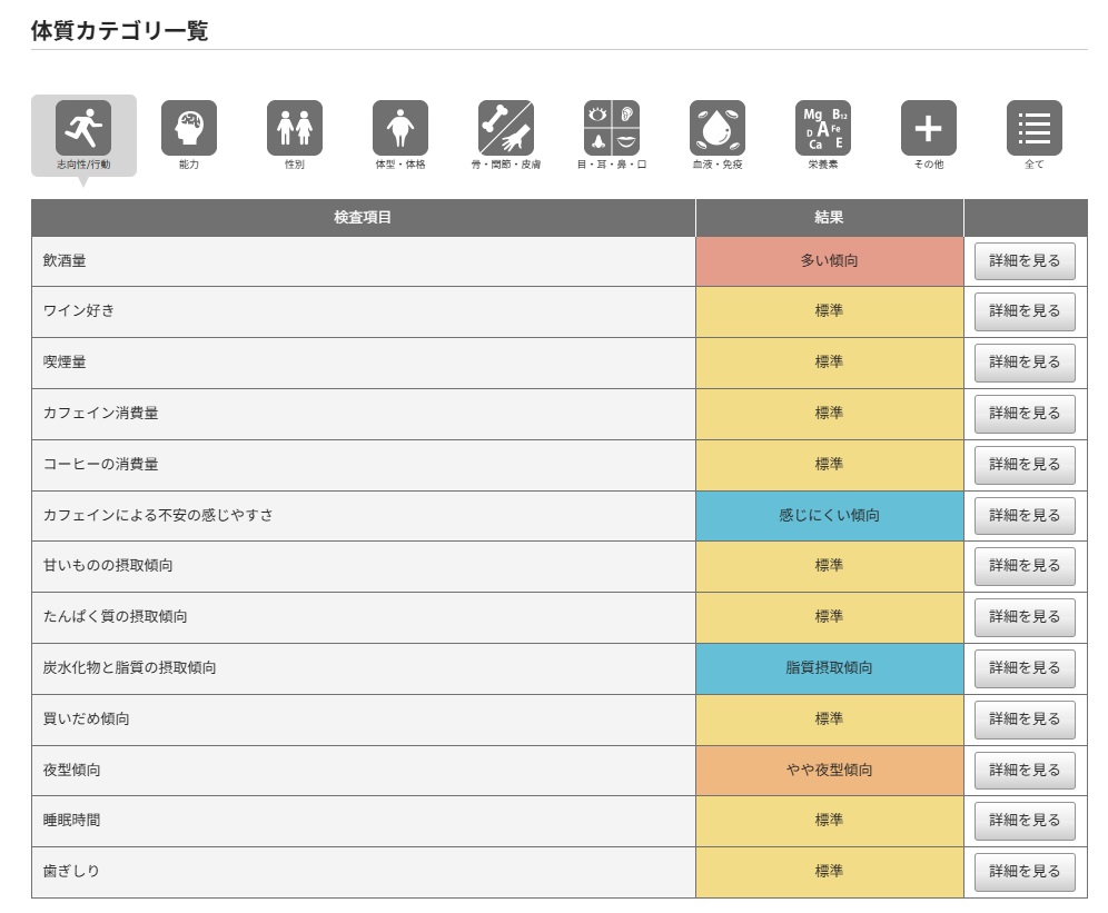 このキットは、肥満タイプ、筋肉タイプ、肌質傾向、ストレスや睡眠のタイプなど、幅広い分野にわたる遺伝的傾向を総合的にチェックします。データはグラフやコメントでわかりやすく表示されており、自分の特徴を把握しやすい設計です。