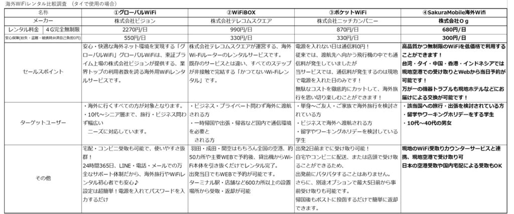 – 上表の通り、価格や品質,利便性を比較調査しました!